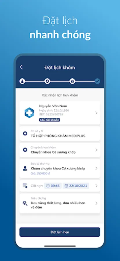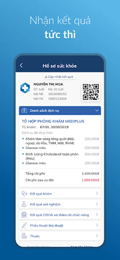 Electronic health records store all health records (including examination results, test results, imaging results, prescriptions, etc.. consumables, medical expenses, etc.) if you need to be hospitalized for treatment ) at your MediPlus clinic on your smartphone, allowing you to access it anytime, anywhere. All your medical examination information at Mediplus clinic is stored on the application according to the standards prescribed by the Ministry of Health, ensuring confidentiality, integrity and availability.