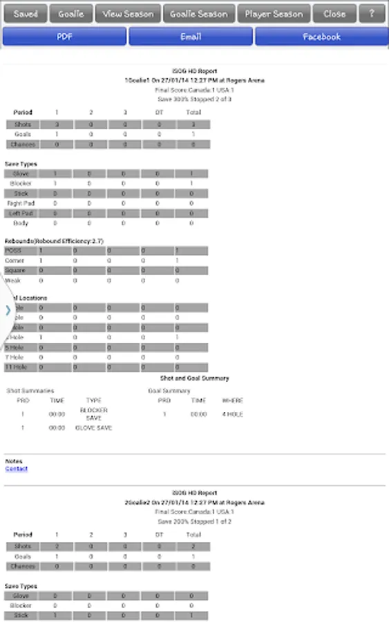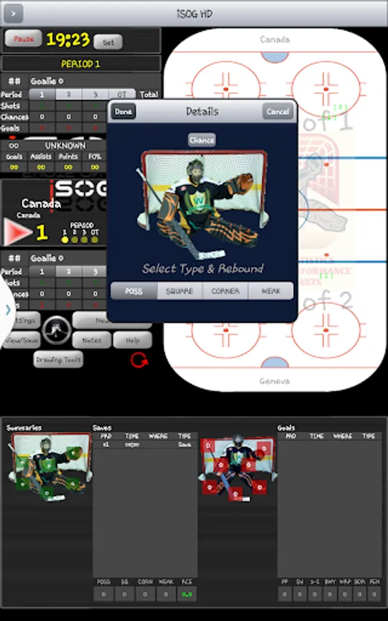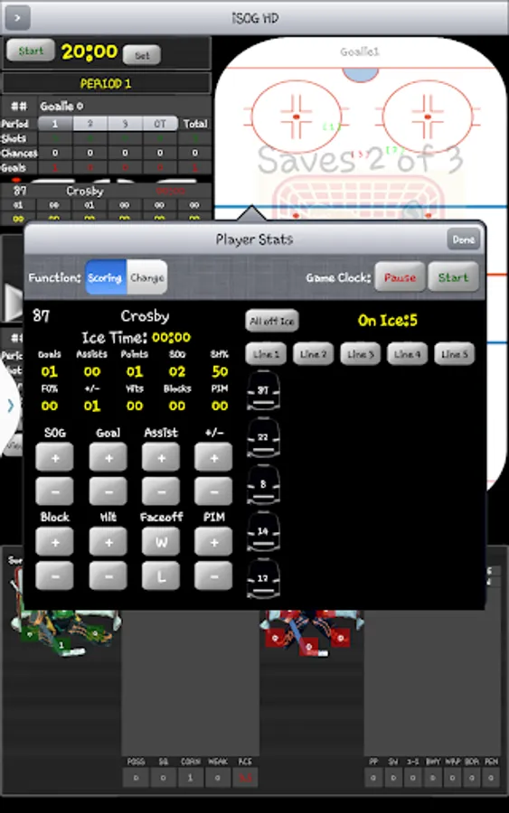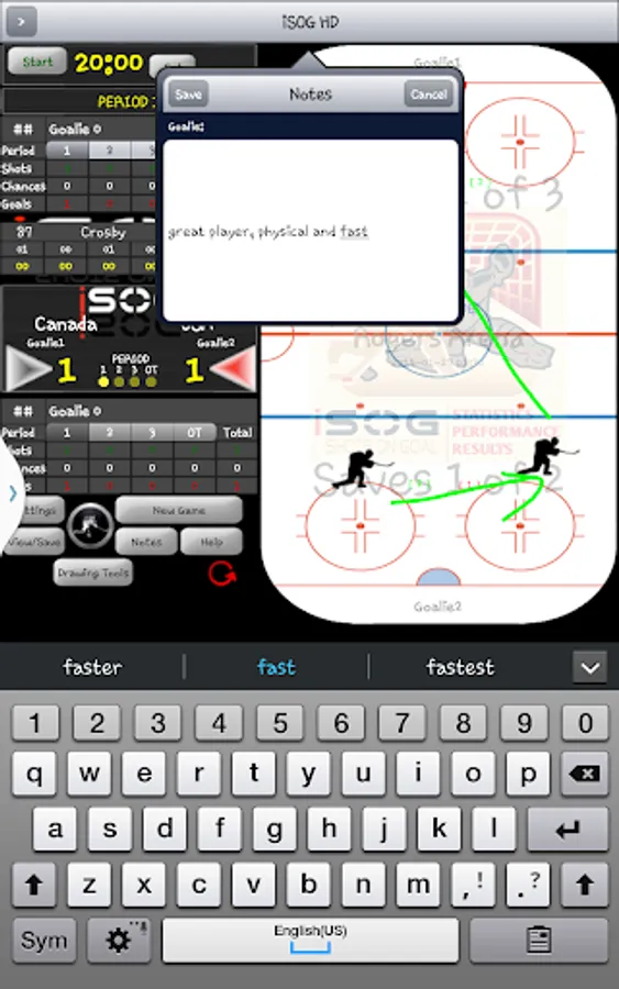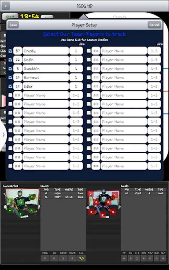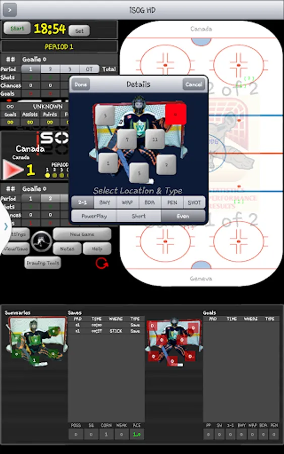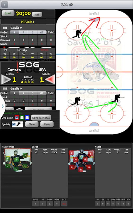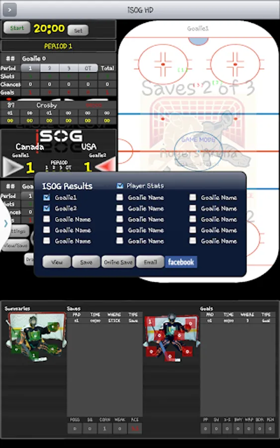 The new iSOG HD PRO designed for tablets, provides detailed ice hockey goalie and player stats for up to 15 goalies and 28 players, providing shots on goal, where saves were made, where goals were scored, types of goals. Left & right hand goalie config. Emailed reports and Facebook publishing for tracking and analysis including in-game mode with real time game clock. Player stats include ice time, face off, blocks, hits, plus minus, points goals, assists, penalty minutes, shots on goal and percentage. Season review and saved stats. All in ONE ice hockey stats App