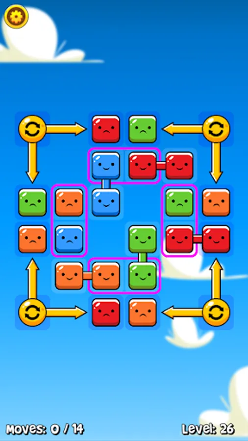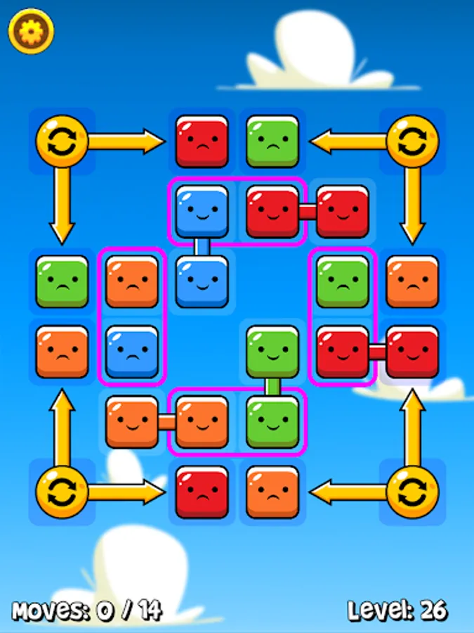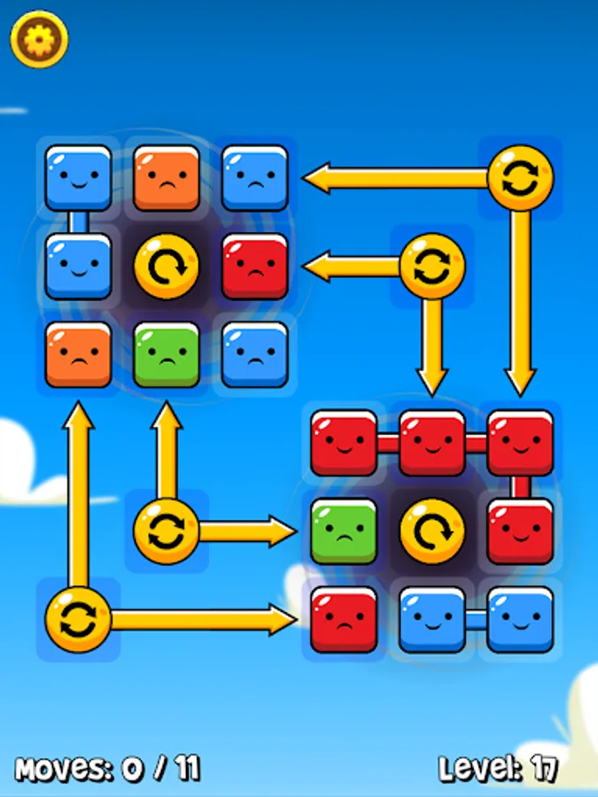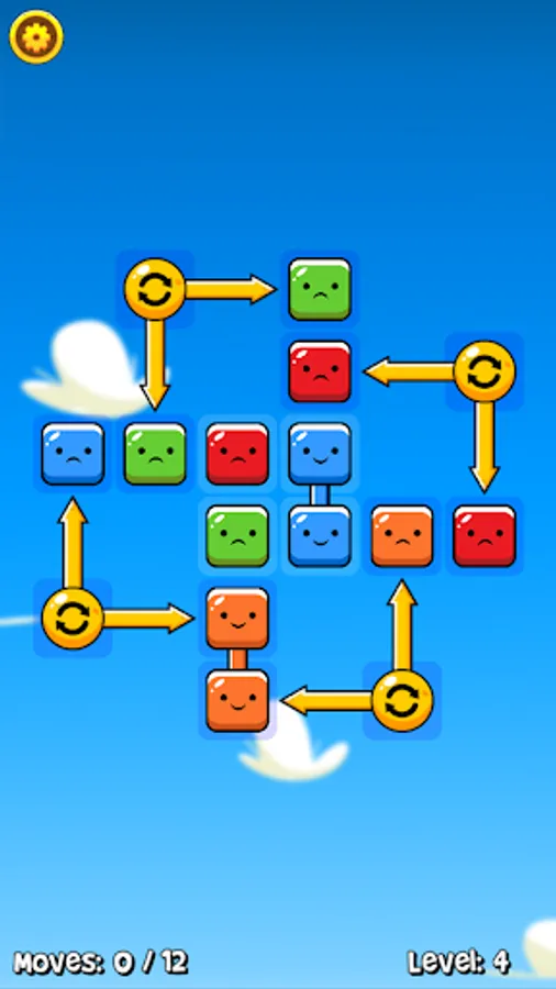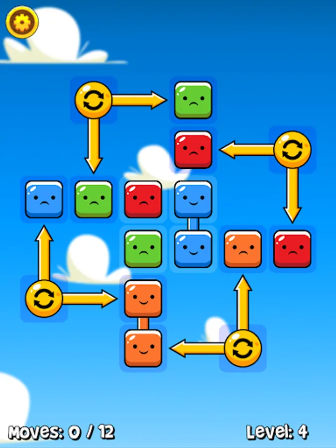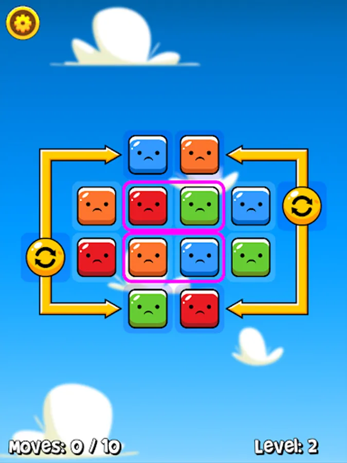 Tap a block to select it, then tap an adjacent block to make the swap. When blocks are joined together they're happy, but when they're all on their own they get sad! Use the special blocks to your advantage, as there's more than one way to complete a level and you only have a certain number of moves! Once you've reunited all the blocks, the level is complete!