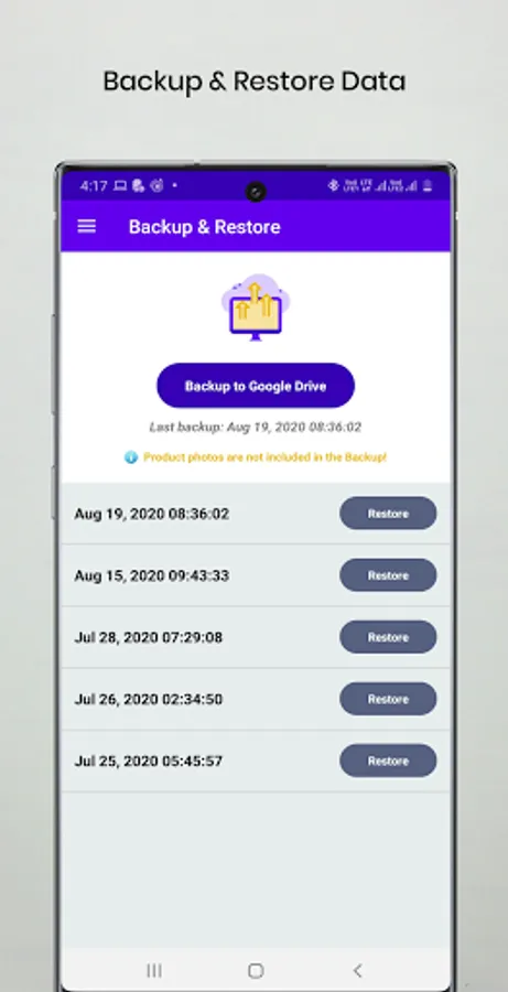 The data on Price List Lite is owned and only accessible by the user. Your data is stored locally on your mobile device. When creating backups, the data is stored in the user's Google Drive post-authentication.