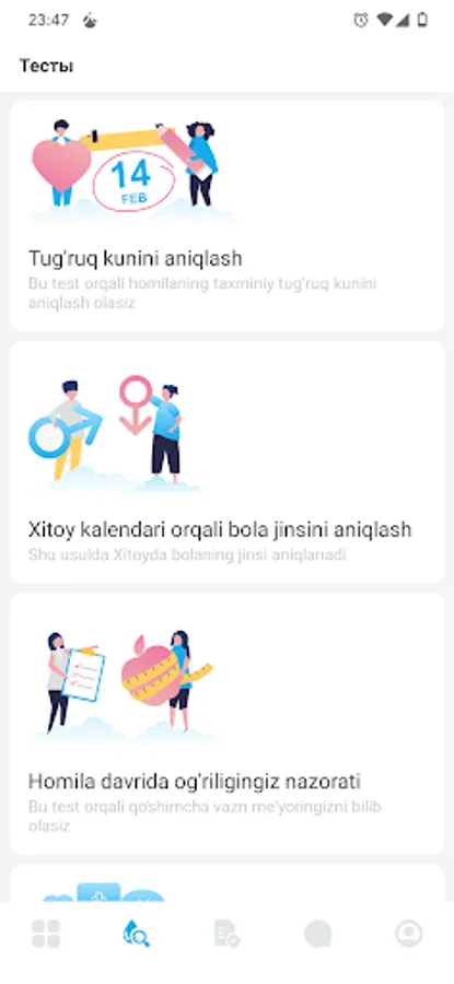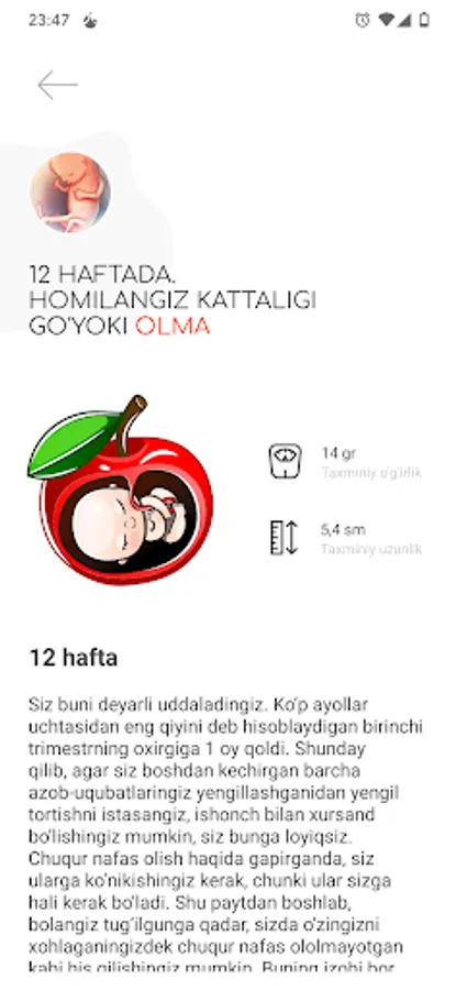 Homiladorlik haqida to'liq haftalik ma'lumotlar, homiladorlikni rejalashtirish, homiladorlik kalendari, homiladorlik bilan savol va javoblar almashinish uchun yaratilgan mobil ilova.