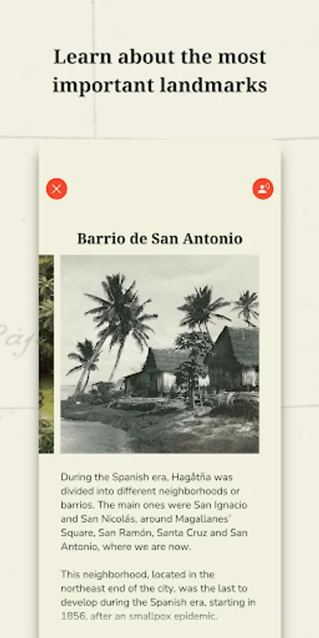 Welcome to Guam. Discover the history and heritage of this pearl of the Pacific. This reconstruction, developed with the most rigorous research and the latest immersive technologies, will transport you to another era. Travel back in time to discover what life was like in 19th-century Guam. Visit cities lost in memory and explore buildings that have already disappeared, thanks to augmented reality.