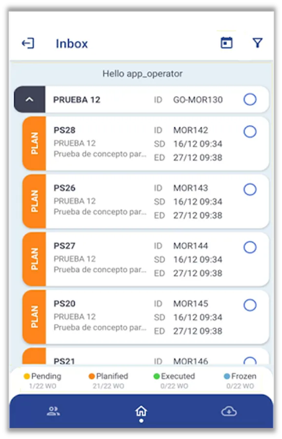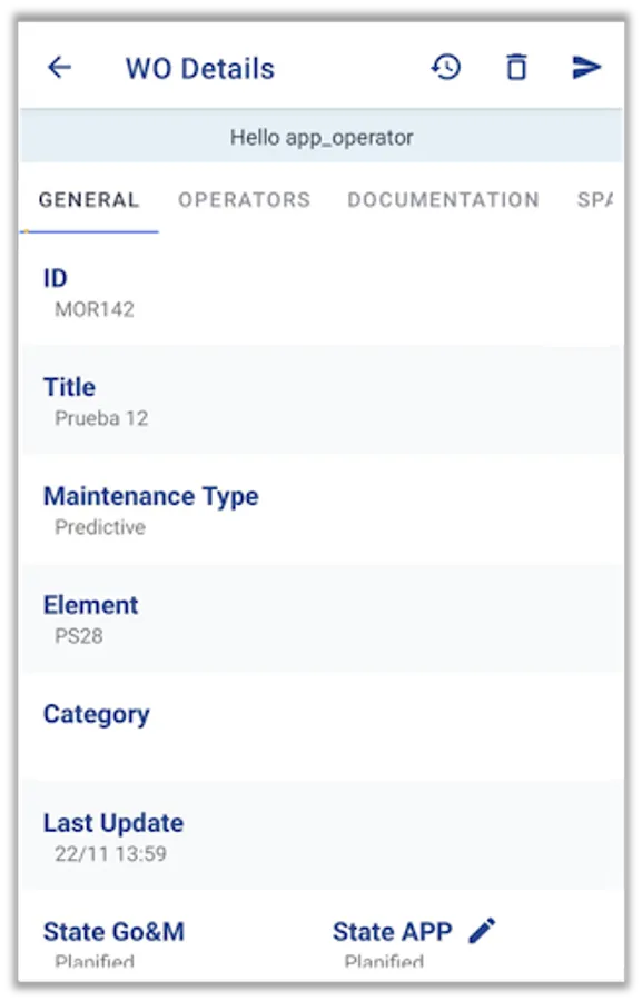 Dicha APP estará vinculada al sistema GO&M que hará de sistema maestro, pero permitiendo al usuario conocer, con un dispositivo móvil, qué acciones debe ejecutar accediendo a las órdenes de trabajo asignadas a él, así como tener capacidad de cumplimentar el formulario que da lugar al parte y enviarlo una vez que ha terminado.