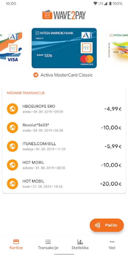 Intesa Sanpaolo Bank Wave2Pay brings you the convenience of contactless mobile payments using Banka Intesa Sanpaolo virtual cards. For contactless mobile payment, you must have a mobile phone with Android 6.0 or higher and NFC support. Wave2Pay mobile application also provides an overview of purchases, purchase notifications, their location, card balance, shuffled keyboard, etc.