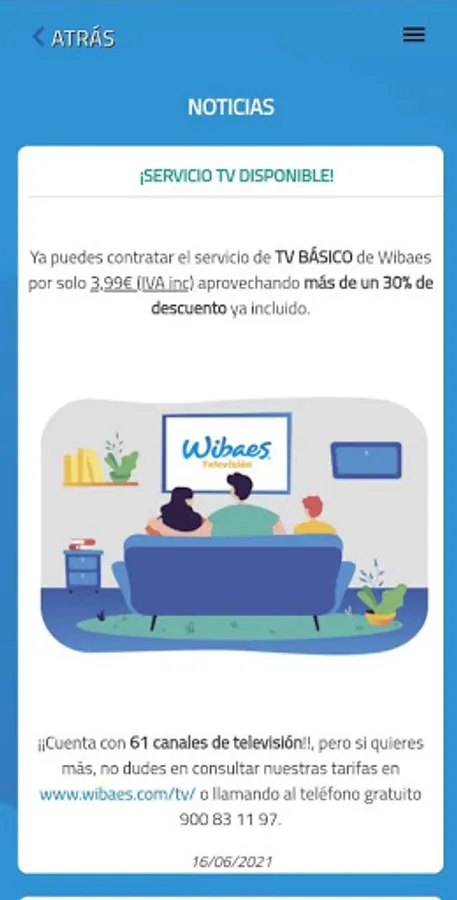 From our App you can carry out a multitude of procedures with Wibaes from the comfort of your home, such as viewing your active contracts, viewing your consumption, downloading invoices, opening support tickets and many more options.