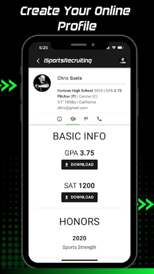 1. Sign Up, and upload your academics (transcripts, ACT/SAT results) and athletics information (sport, stats, highlights videos).