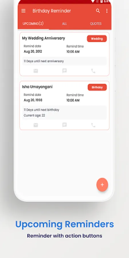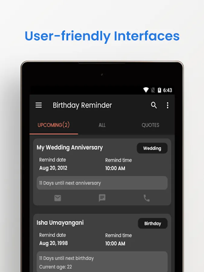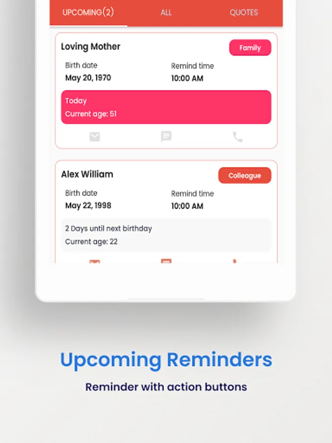 See upcoming birthdays on your home screen using one of four widgets. Say Happy Birthday via text message or tap to call them.