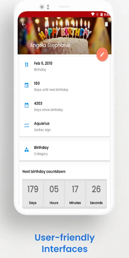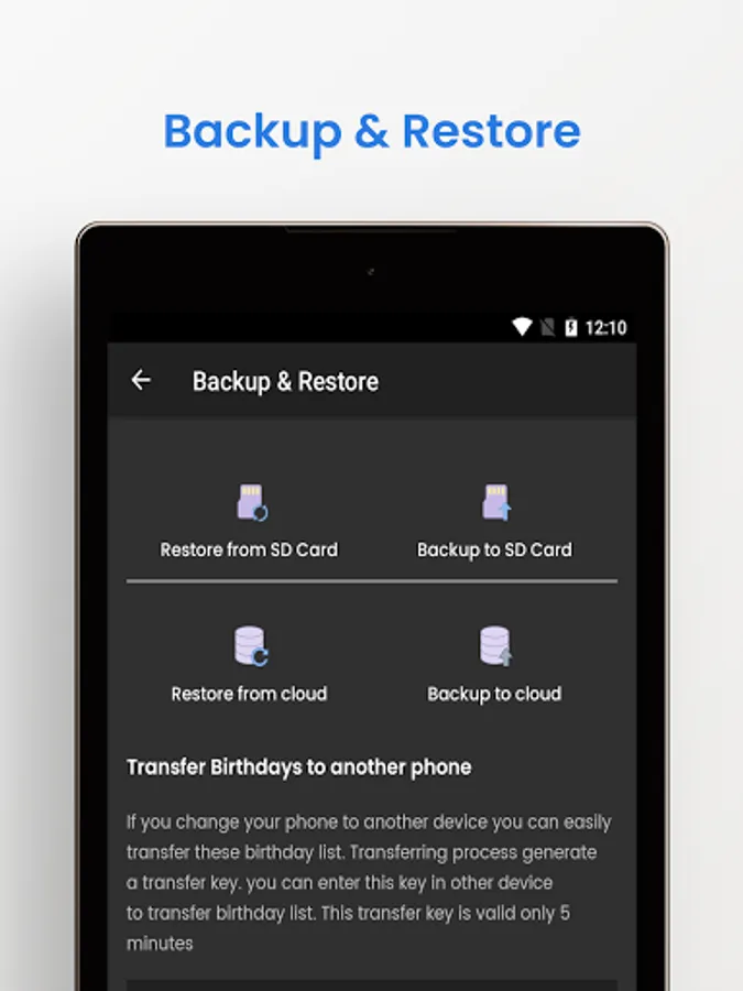 Your birthdays will never be lost. The app synchronizes all birthdays with your contacts list and offers secure backups of all dates to the external storage. They can be easily transferred to another Android device anytime. You'll l always know which day of the week your friends - and how many days are left until that date.