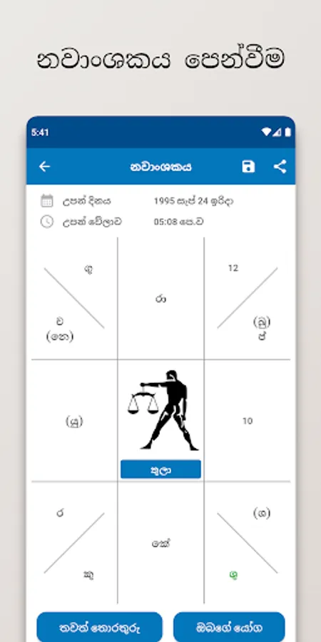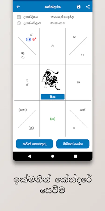 Panchangaya, Maha Dasa, Sputa, Anthar Dasa, Porondam, and Widasa are calculated and shown in the Kendare app. On each house or Bawa, more info is available. Graha Yoga available in Kendare is shown. Uchcha Graha shows in Blue color. Swakshethra Graha shows in green color. Nicha Graha shows in red color. You can save and share Kendare or Horoscope with your friends.
