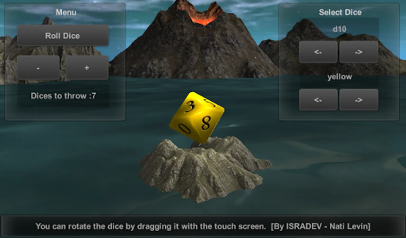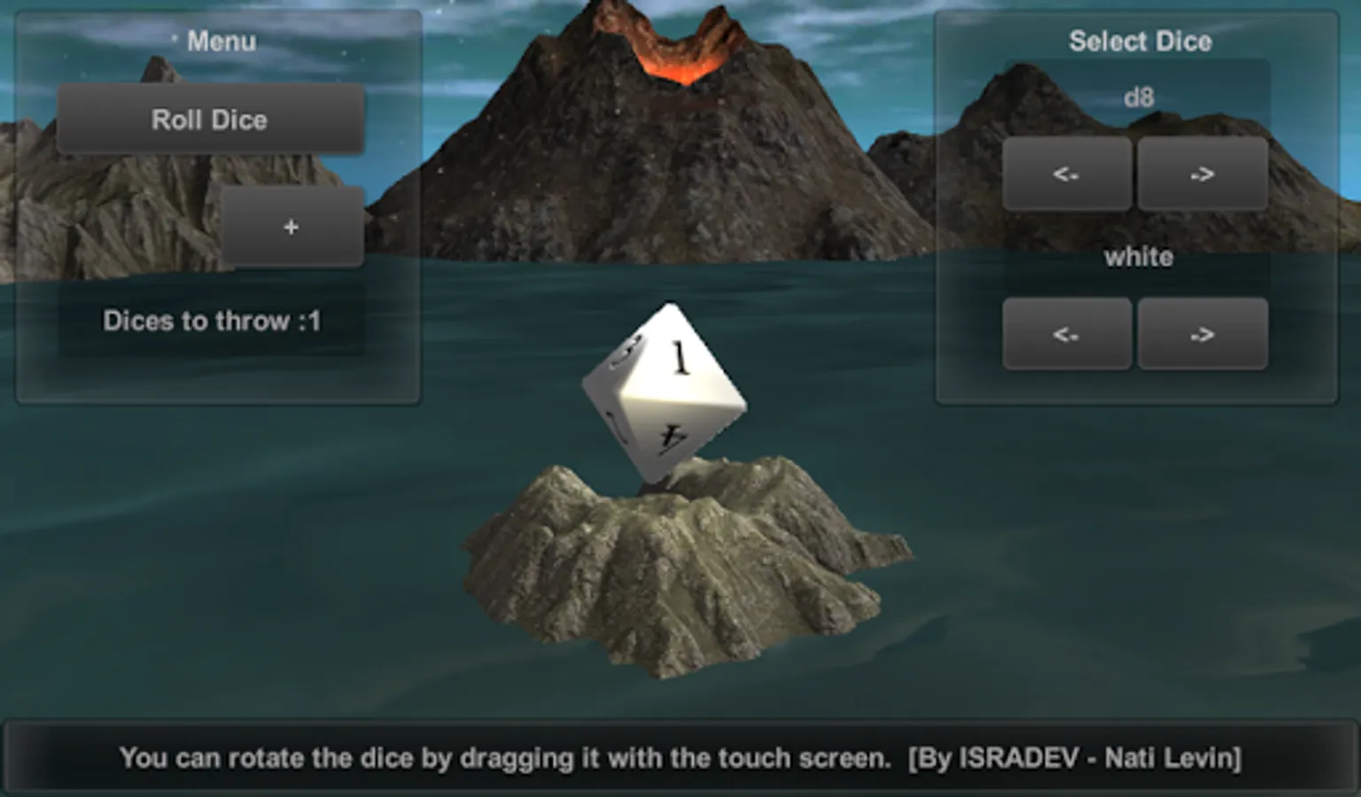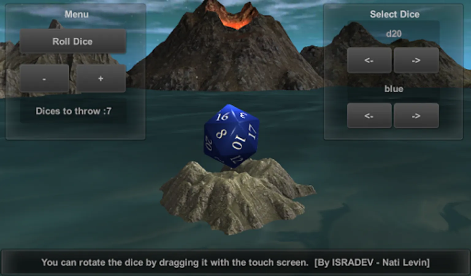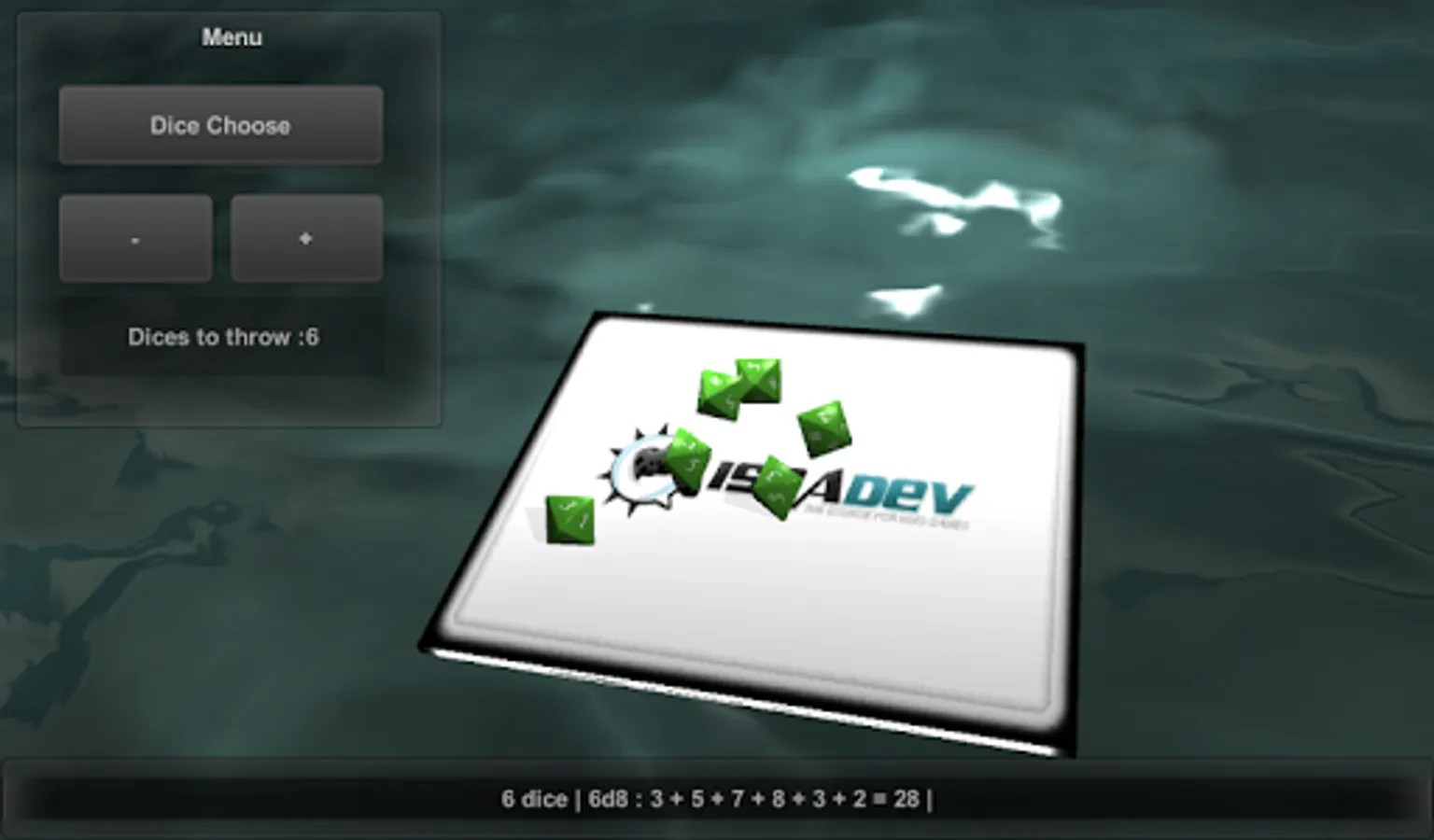 choose between D4/D6/D8/D10/D12/D20 Dices and 6 different colors , check your desired amount of dices to throw on a 3D surface and even get the results of the total summary of all thrown dices on floating board with amazing sea background and sound ..