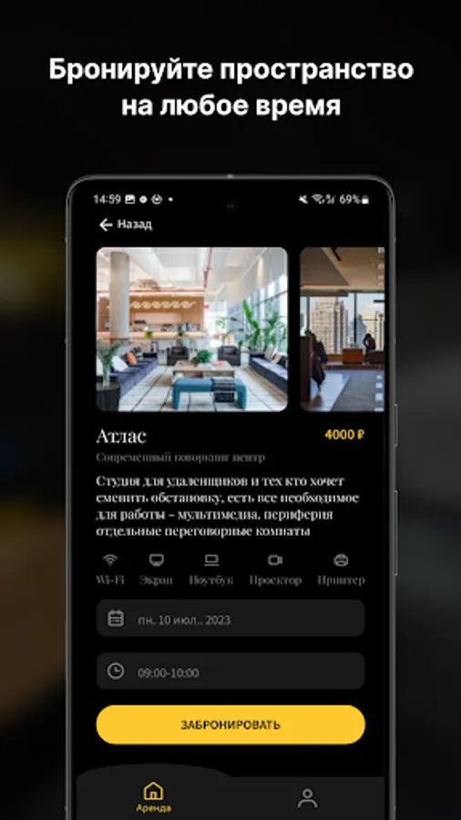 - Резервируйте переговорные комнаты почасово для приема гостей или совместной работы с командами