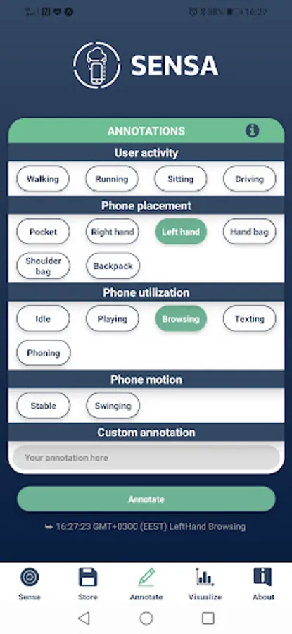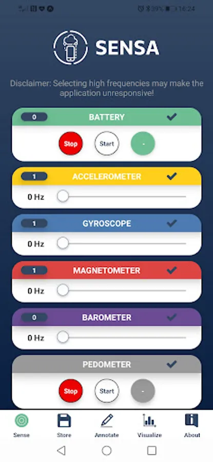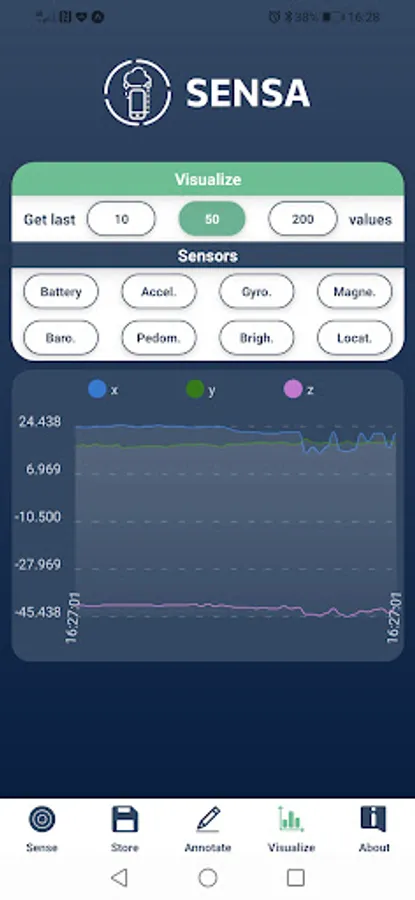 Sensa shows basic incofmation of your phone (brand, manufacturer, model name, memory, OS version, OS build ID, platform API level), as well as records and stores data from your phone's sensors. These include the Battery level, Accelerometer, Gyroscope, Magnetometer, Barometer, Pedometer, Brightness, and Location.