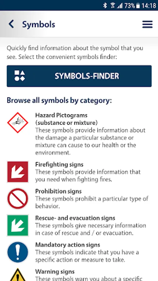 Using the app, the meaning of a symbol can be traced. By answering three questions about form, color and the type of image the app automatically searches the symbols that comply with these characteristics (eg bans, commandments, warning and hazardous properties of substances and mixtures). By selecting the corresponding symbol a brief explanation of the meaning is shown.
