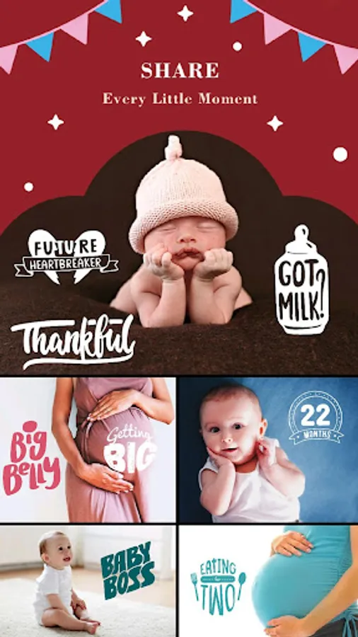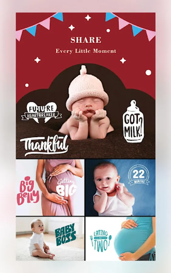 Baby Photo Editor - Pregnancy Milestones is the best and free baby pics editor to create your baby story, baby book and pregnancy milestones. Baby Photo Editor allows you to create your baby story, track your precious pregnancy milestones and baby pics. Baby Photo Editor is a truly stunning and delightful photo editing app for new born baby, parents-to-be and new parents. Celebrate belly bump and capture your precious moments and turn them into lasting memories and create beautiful baby story. Use the most beautiful collection of handpicked fonts, professionally designed filters and hand-crafted 2500+ artworks (Text Arts) and baby stickers to create lasting memories of your little ones. Capture precious moments of your pregnancy to baby's first day of school and celebrate the joys of motherhood. Capture your baby bump growth week by week, first kick, first smile, first steps, baby shower or messy moments. Add adorable artwork & treasure the special moment forever. 'Baby Photo Editor' has all artworks for every occasion to create adorable baby art and baby pic.