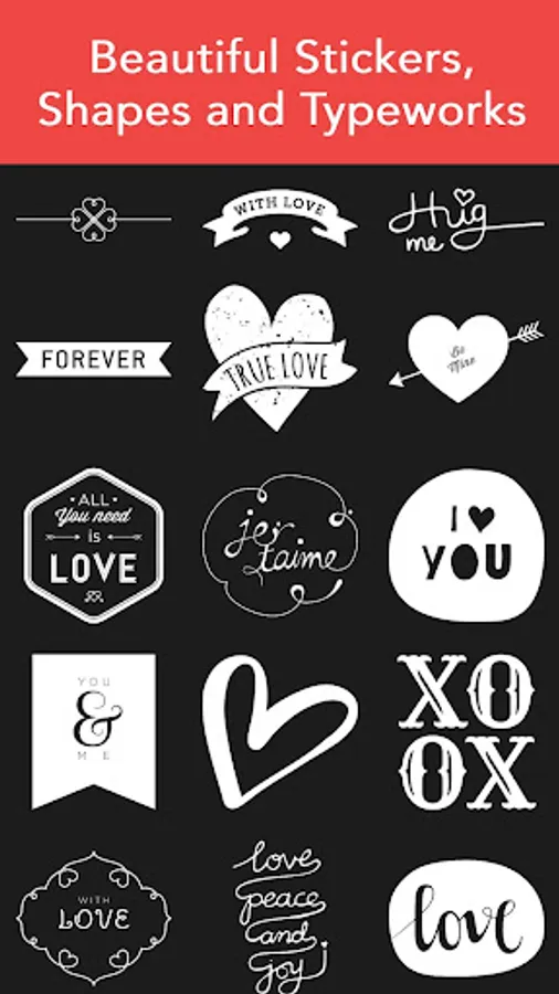 - 700+ beautiful stickers, shapes and type works (text arts). There are 16 different artworks & sticker packs like Christmas, Halloween, birthday, mother's day, botanic(botanical), type words, summer, love, hipster collection, hipster geometry, sacred geometry, tea coffee, doodle icon and much more.
