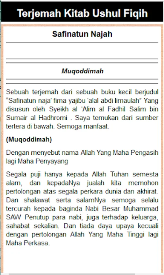This application provides an explanation in the form of translations Indonesian which includes discussion of the translation of the Book of safinatun Najah, book mabadi awaliyah and 40 koidah, hope to have good benefits, please give us comments and suggestions to develop this application via email us at SuportistanStudio @ gmail. com.