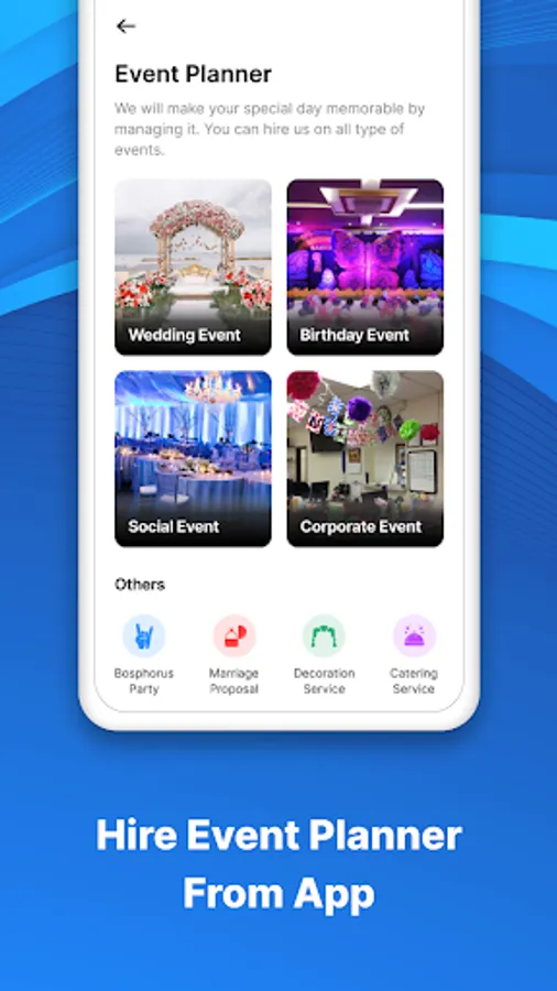 Planning an event? Let our app handle the details. From weddings to corporate events, we'll help you find the perfect venue, catering, and more.