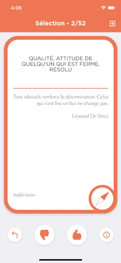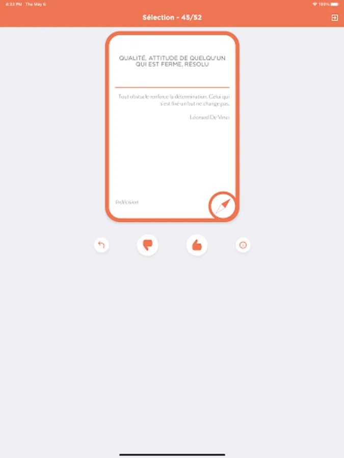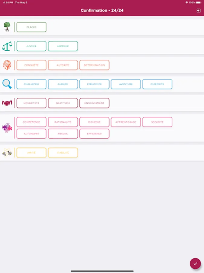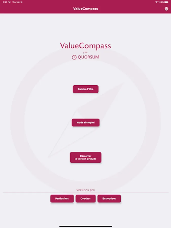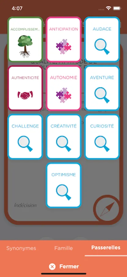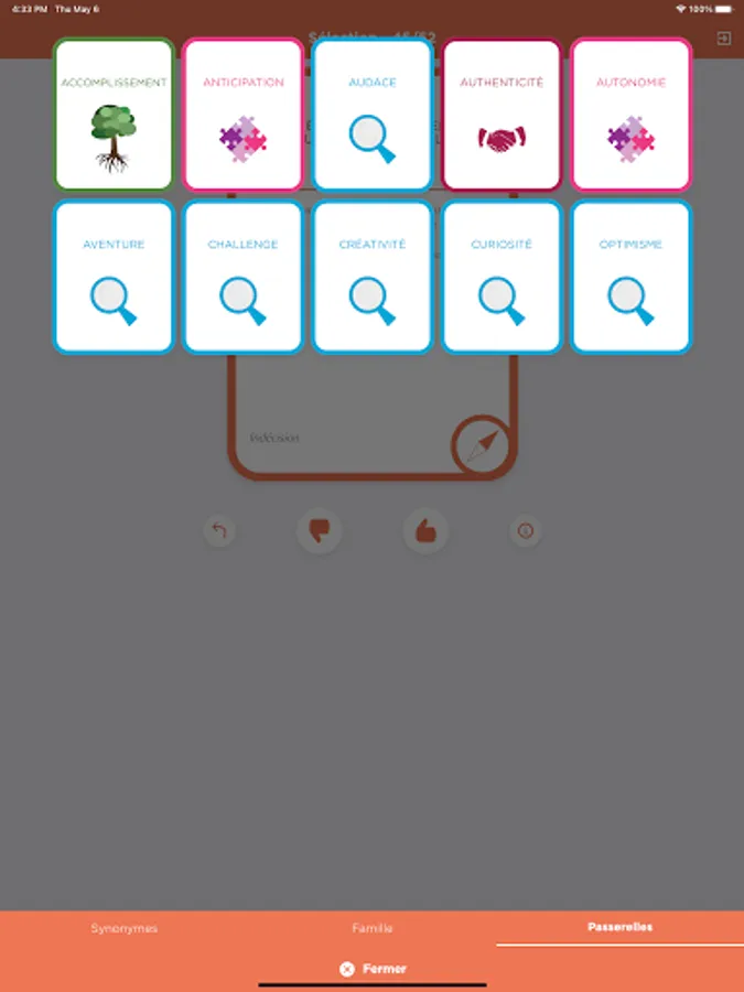 ValueCompass facilitates the reflection about the values that motivate and guide you during important decisions. In a simple and fun way, you will gradually select among the proposed values those that are most important to you. Moreover you will discover the contexts that enrich them. As such, For each value, you will have access to its synonyms, its family and its bridges to other families of values.
