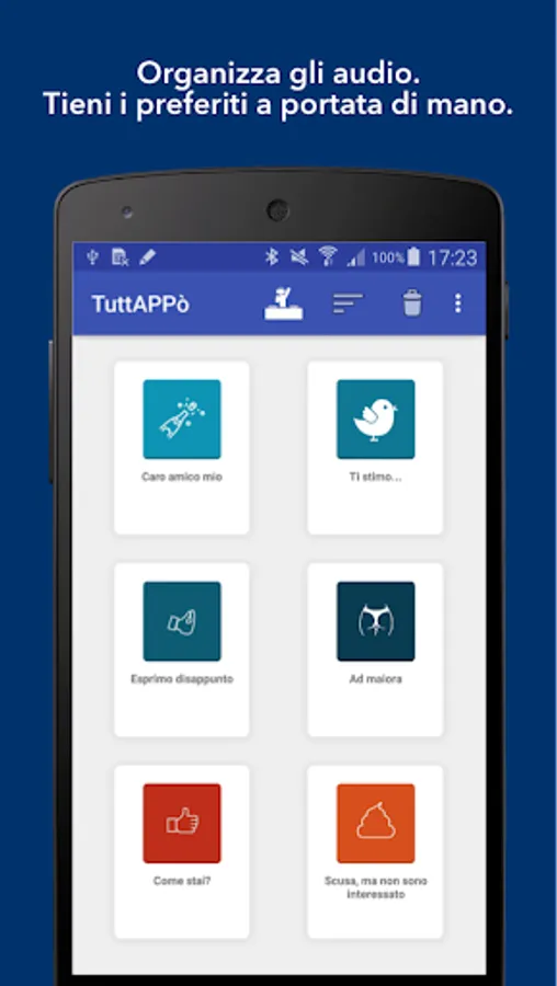 For all those times that things do not go as hoped, in those days that I really understood everything and would like to express your disappointment at all the stress that you have accumulated in those moments when they ask you: "Cum'è, tuttappo? "... stop for a moment, start the app, click the icon that best expresses your mood, listening to audio and made two stress-relieving laughter, perhaps sharing with friends.