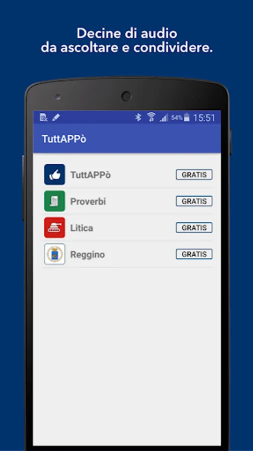 TuttAPPò is the app that allows listening and sharing, for purposes exclusively ludici and goliardic, of a series of expressions and typical interlayers of calabrese dialect spoken.