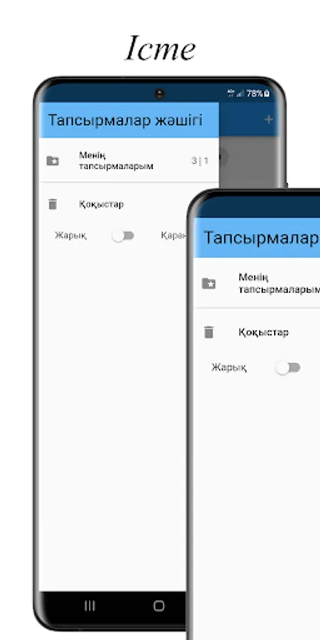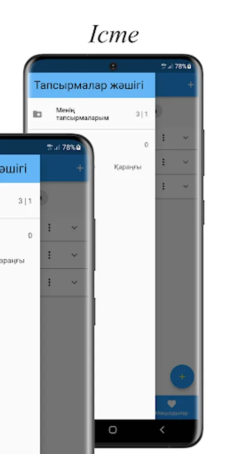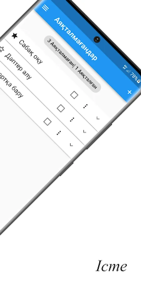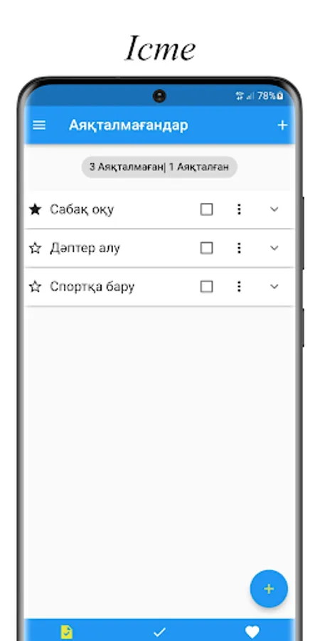 Iste is an application in the Kazakh language where you can save to-do lists. Change the status of tasks from incomplete to completed. And you can also sort more important things on a separate page.