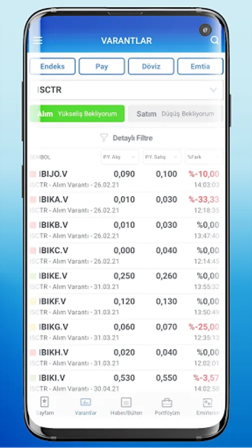 With the İş Warrant Mobile application, you can follow the warrant market, make detailed analysis of IS Investment warrants using calculation tools, compare the warrants for the underlying asset you want with the smart warrant filter, and choose the most suitable warrant. You can trade with free live data on the demo account.