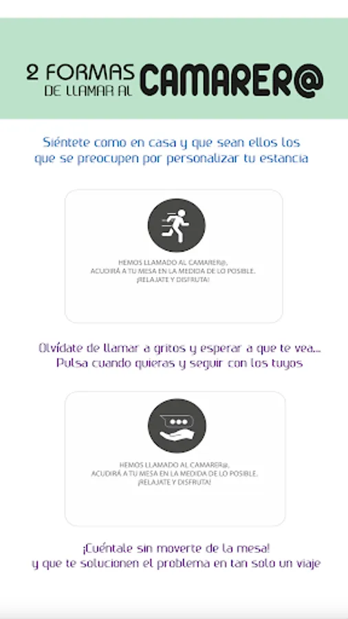 -Let the waiter come!; Forget about having to raise your hand loudly and avoid anger that will no longer be necessary. Press the call button and select this option, the App will automatically notify you.