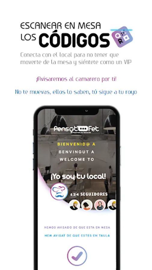 - Press the code icon to scan and thus link to the location. Pensat i Fet will inform you of your arrival, so you don't have to do anything. Forget about having to get up and leave in a huff.