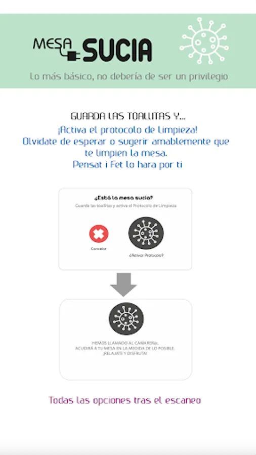 -Is the table dirty or with the previous service? Don't worry, press the “Dirty table” button from the Profile and you will activate a cleaning protocol. The waiter will come with everything necessary to disinfect it. Save the wipes and the embarrassment of having to ask him!