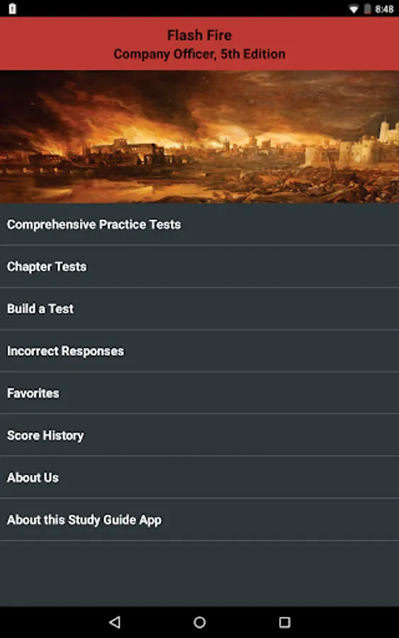 Flash Fire will help fire service personnel prepare for written examinations based on IFSTA Fire and Emergency Services Company Officer, 5th Edition. This study guide app includes a test bank with 800 multiple-choice questions based on the IFSTA textbook. Each question is page-referenced to the book.