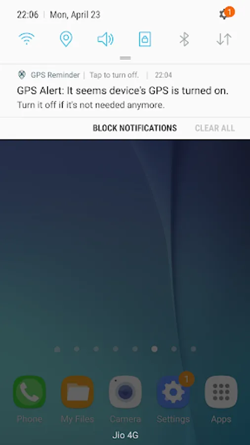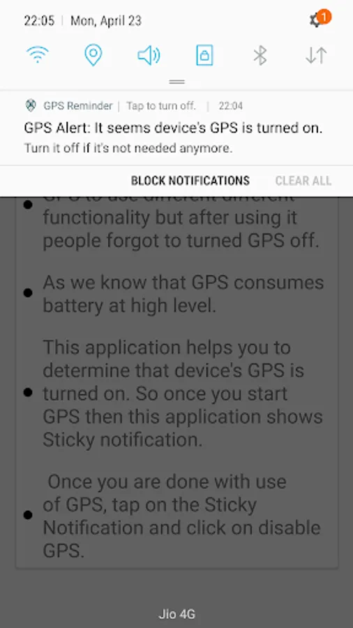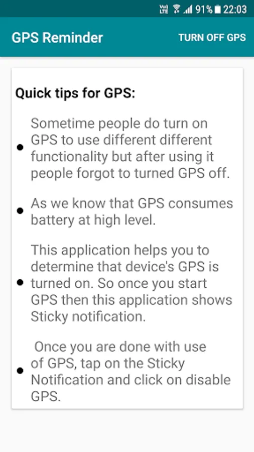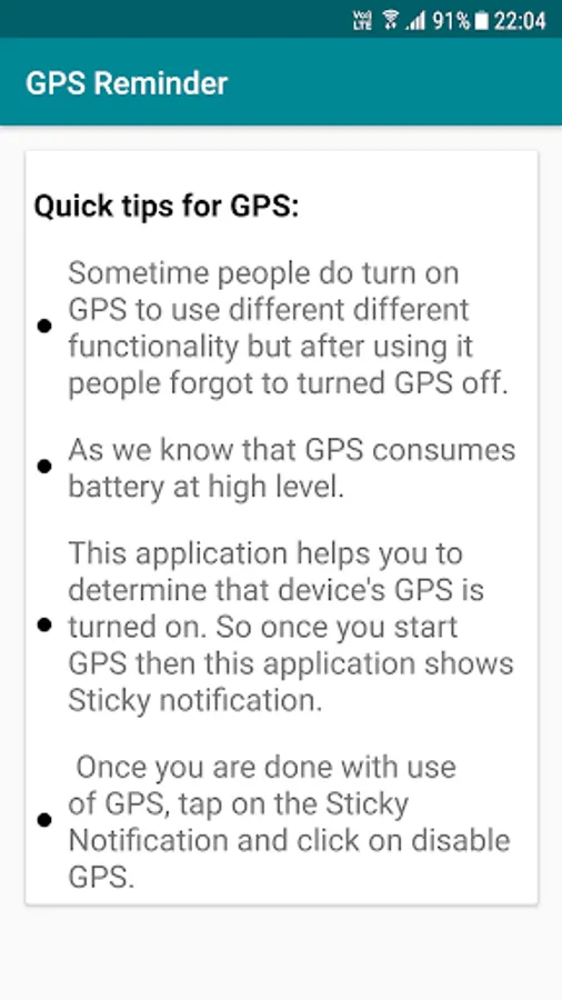 - If device’s GPS is ON then application shows you notification that informs you “If you are done with GPS usage then turn it off to save your battery”
