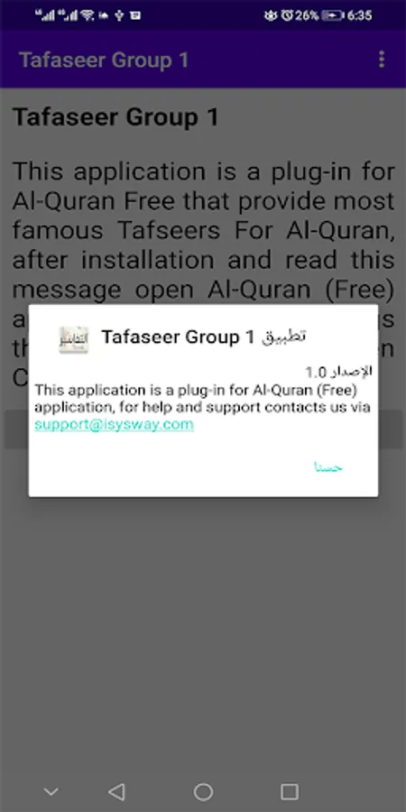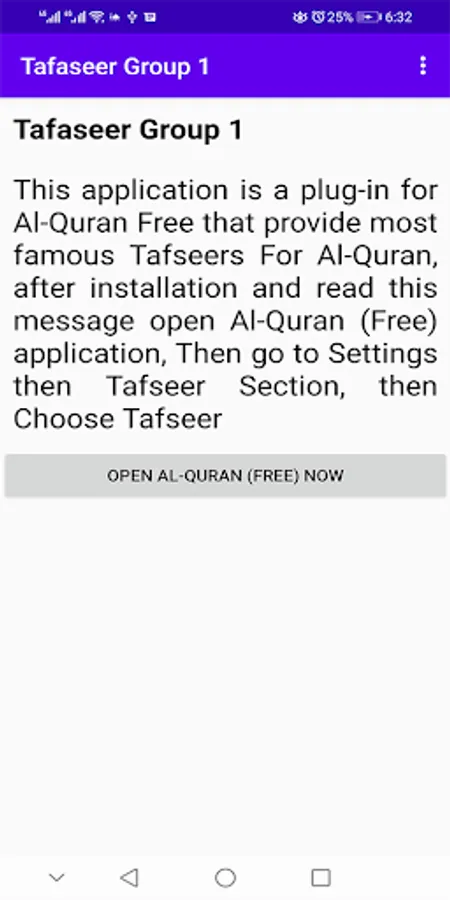This application is a plug-in for Al-Quran Free that provide most famous Tafseers For Al-Quran (Free), after installation and read this message open Al-Quran (Free) application, Then go to "Settings" then Tafseer Section, then "Choose Tafseer"