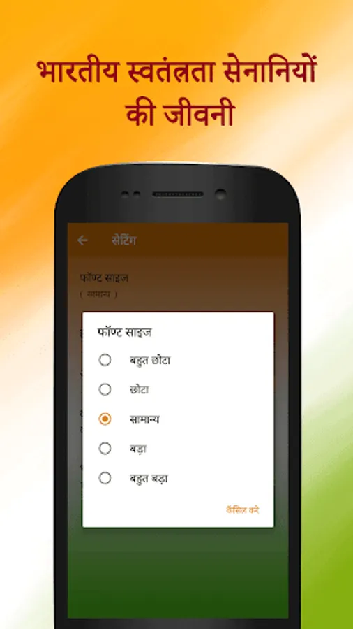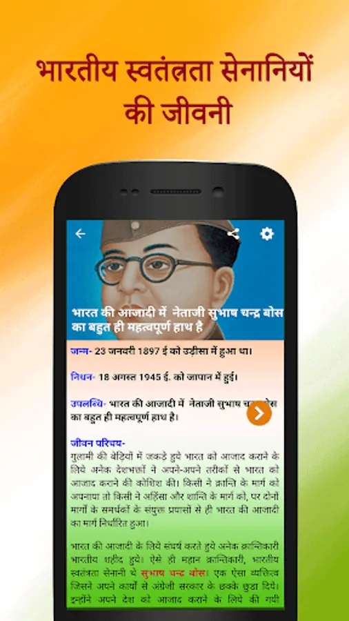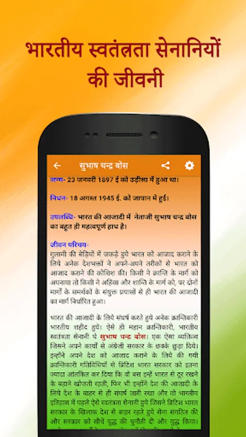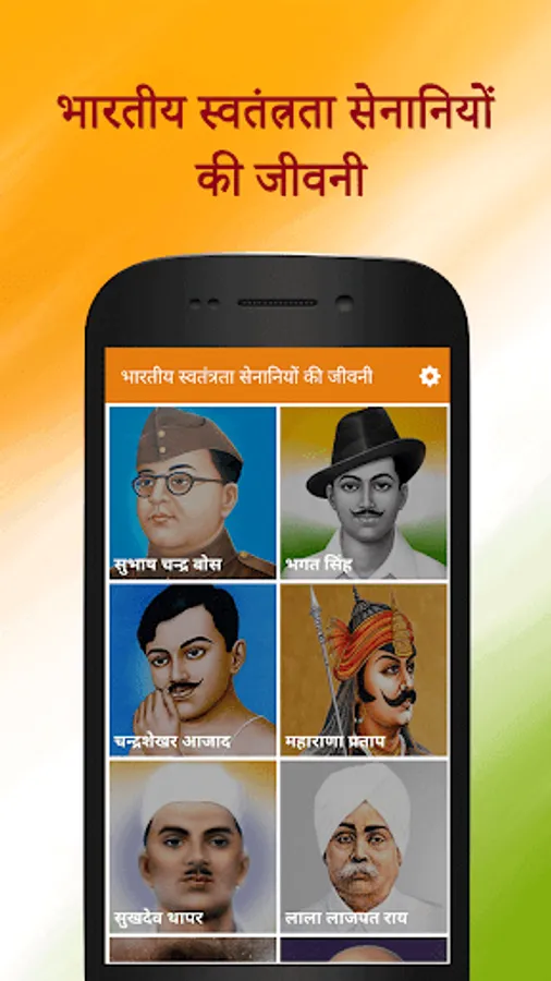 Application contains Biography of Top freedom fighters in HINDI some of them are