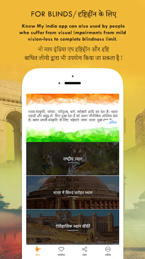 Indian Tourist Places app can also used by people who suffer from visual impairments from mild vision-loss to complete blindness limit.