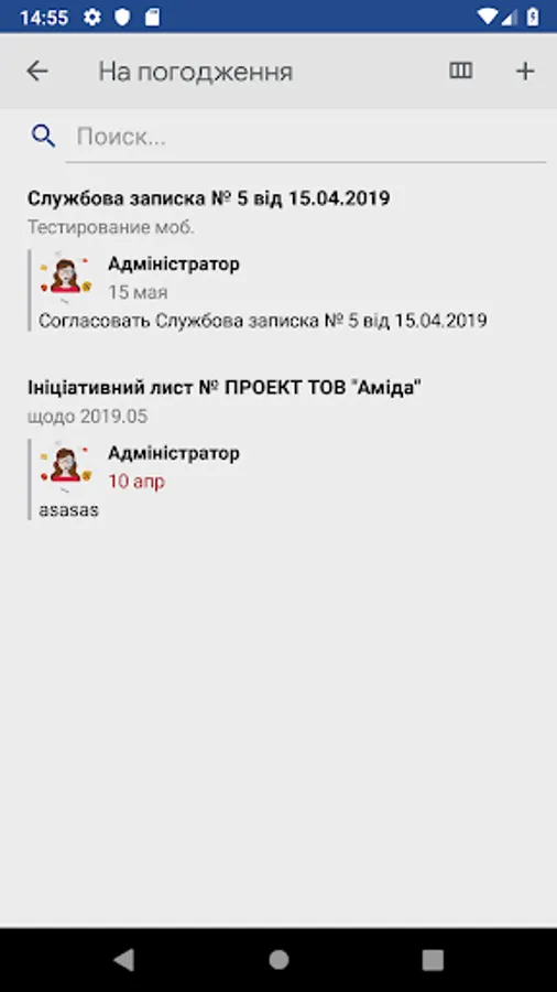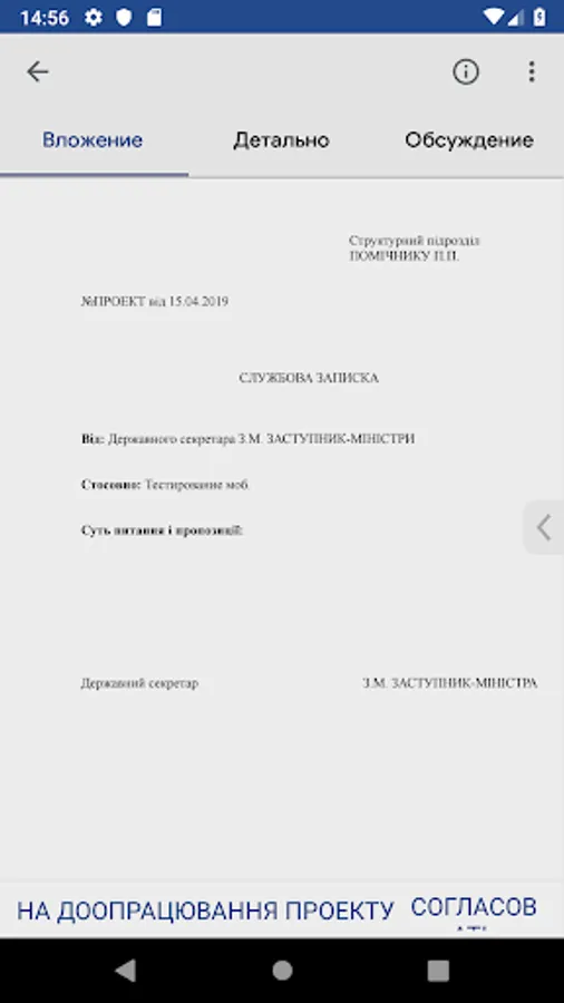 The application allows you to work on tasks together, discuss, delegate tasks, clarify positions before coordination. Directly in the application, you can add, delete, view attachments (scans of documents, tables with calculations, any text, photos, etc.).