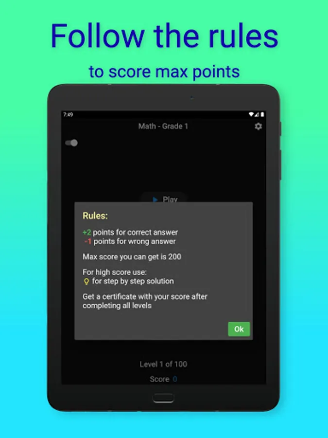 Educational 1st Grade Math with fun questions. Create and share a certificate of your final score. Challenge your friends to see who can score the most.