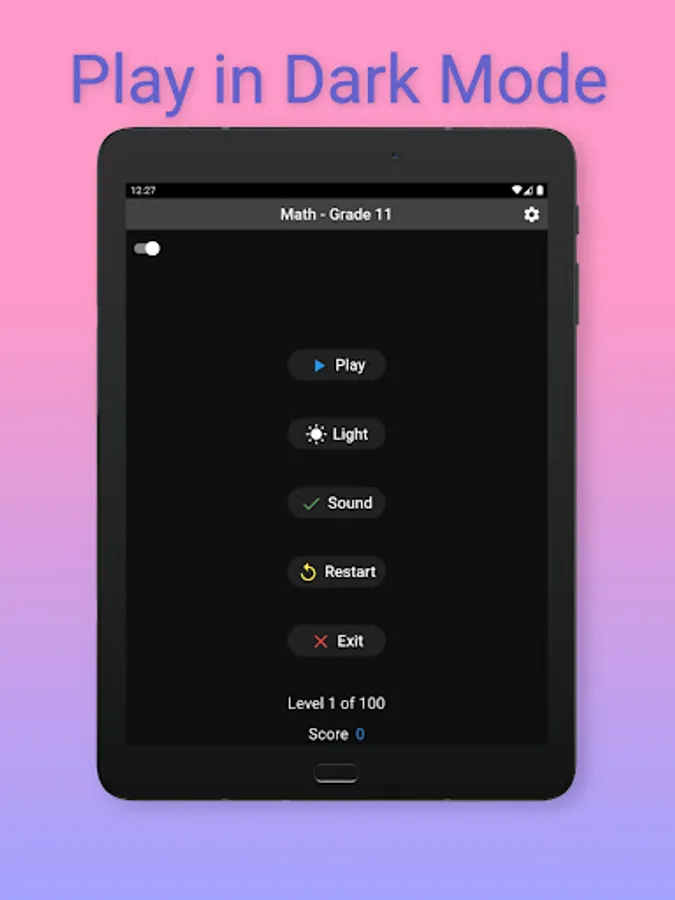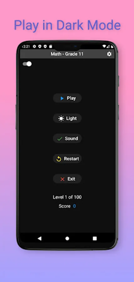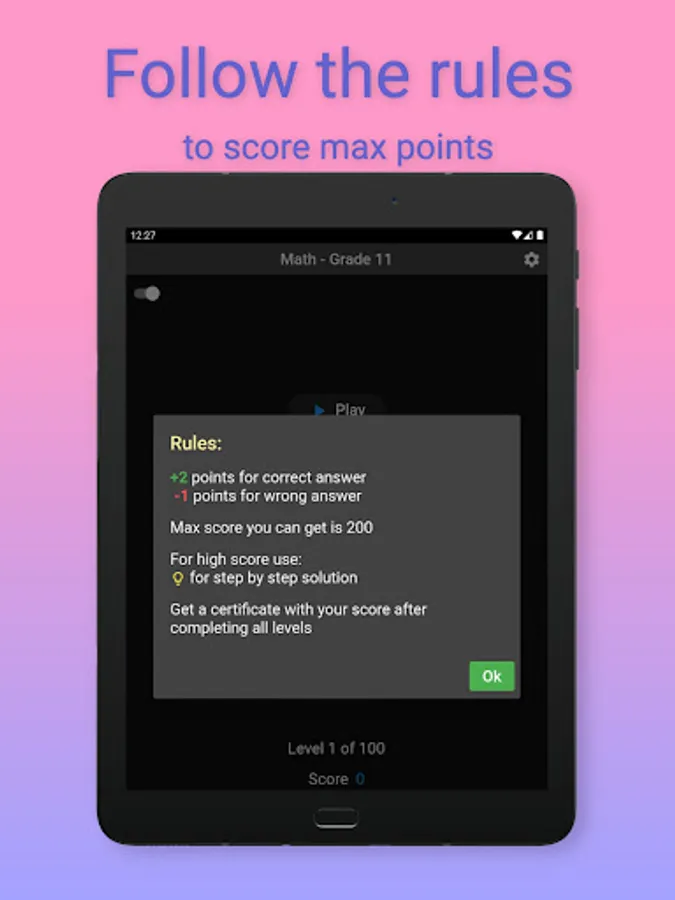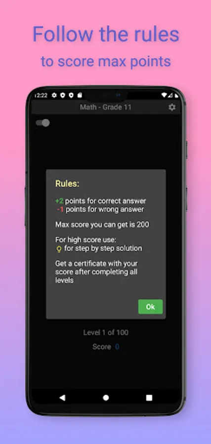 Challenge your mind with 11th grade level Math and see where you stand. There are 100 questions/levels sprinkled with some interesting Math puzzles in between. Create and share a certificate of your final score. Challenge your friends and family to see who can score the most.