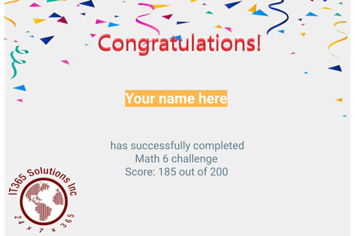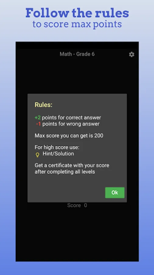 Challenge your mind with 6th grade level Math and see where you stand. There are 100 questions/levels sprinkled with some interesting Math puzzles in between. Create and share a certificate of your final score. Challenge your friends and family to see who can score the most.