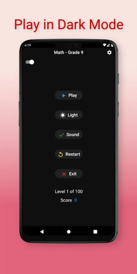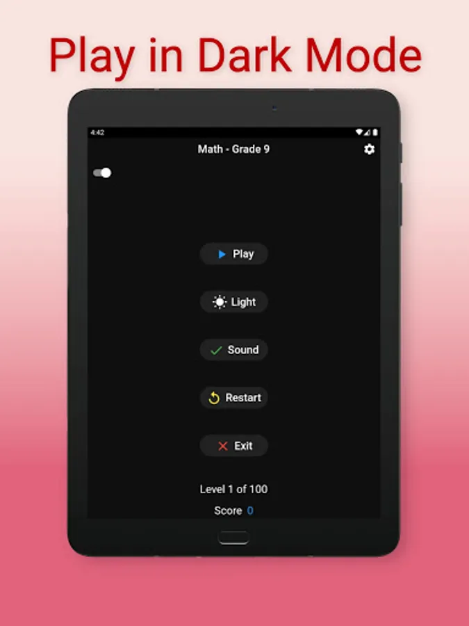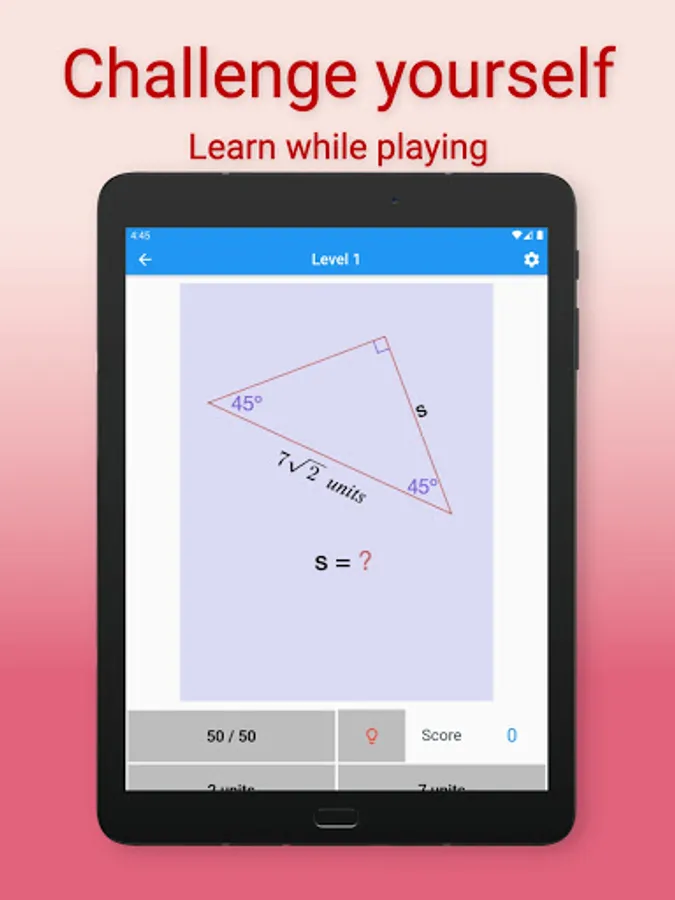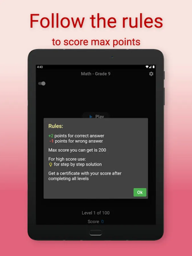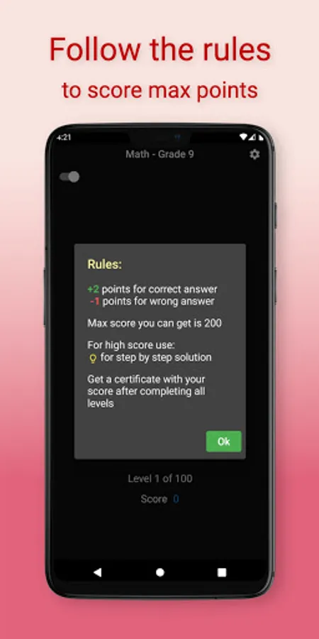 Challenge your mind with 9th grade level Math and see where you stand. There are 100 questions/levels sprinkled with some interesting Math puzzles in between. Create and share a certificate of your final score. Challenge your friends and family to see who can score the most.