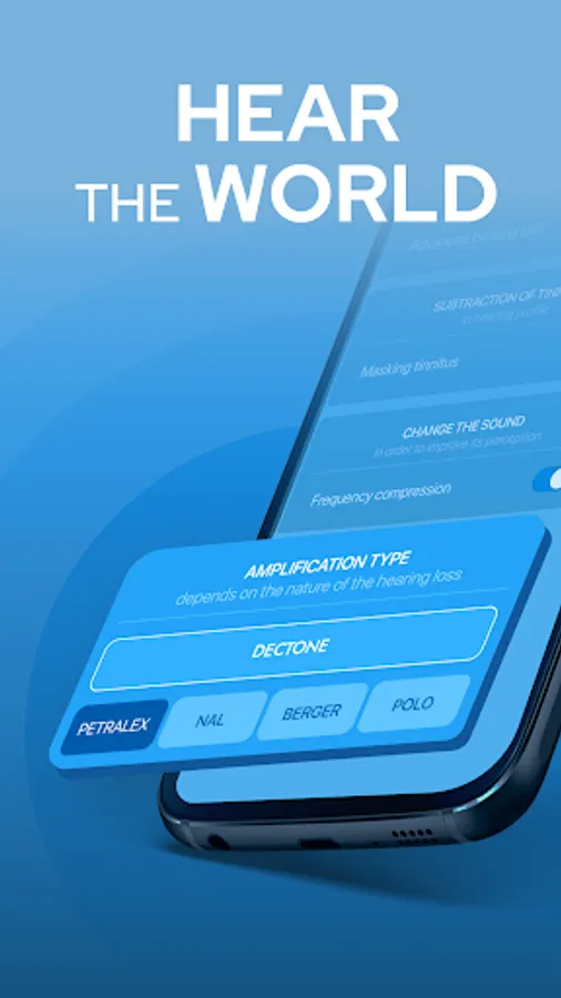 -- Modern Dectone amplification method, that amplify sound even better. Advanced hearing test;