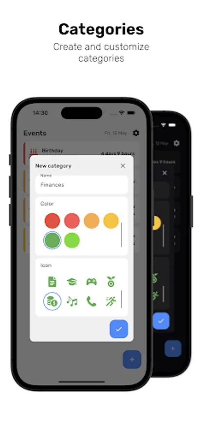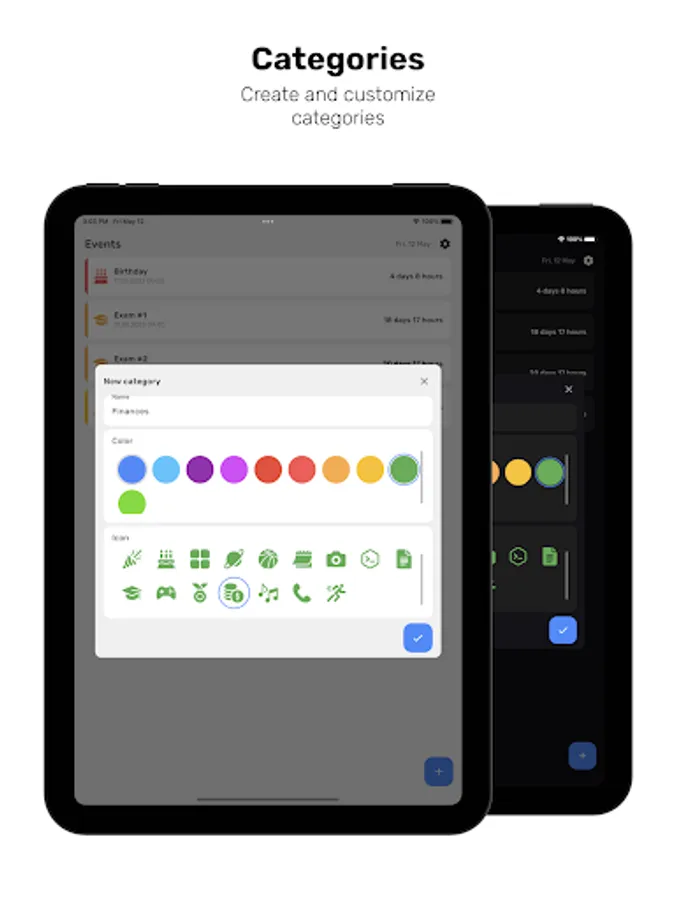 The intuitive interface provides the ability to create and schedule events, customize its category, as well as color and icon.