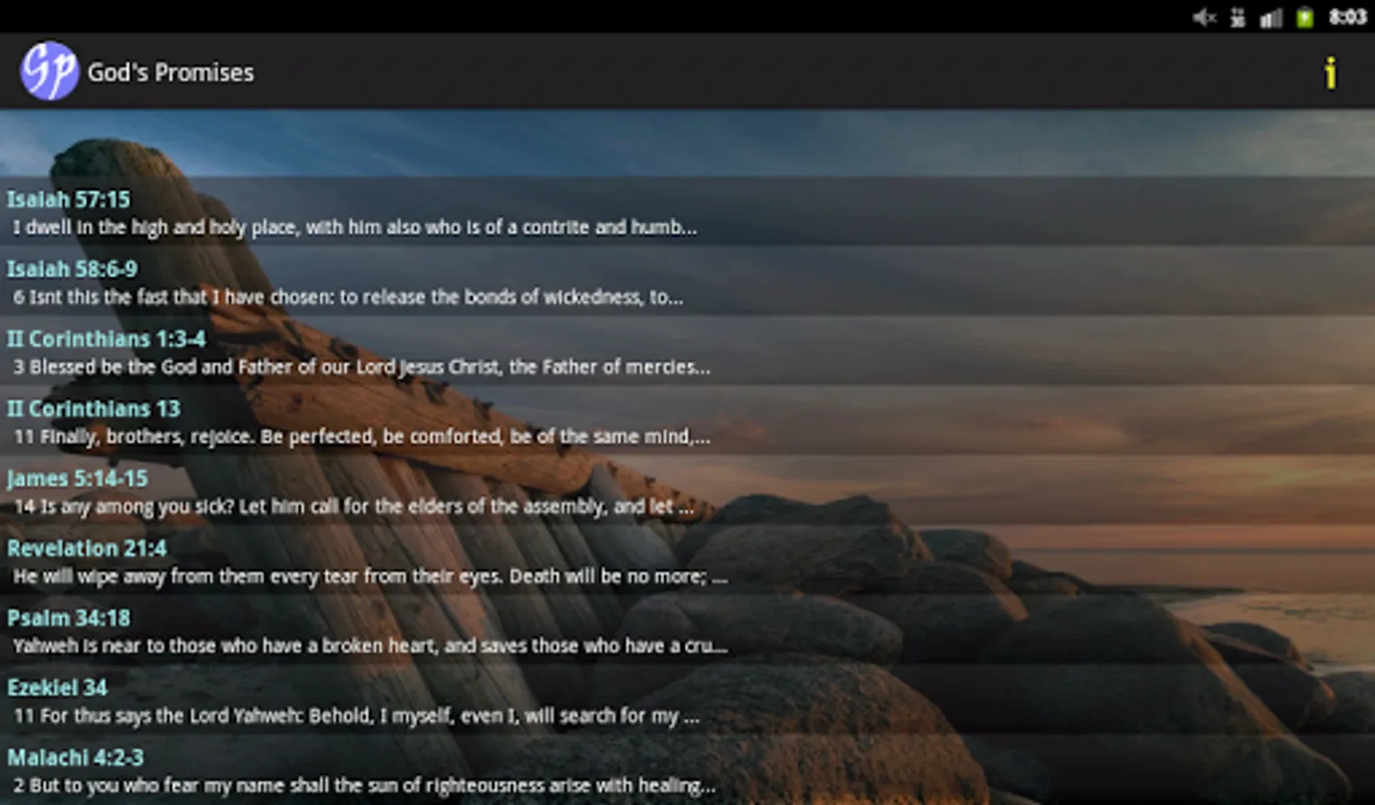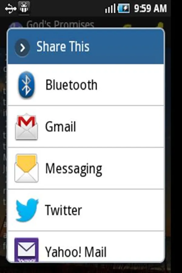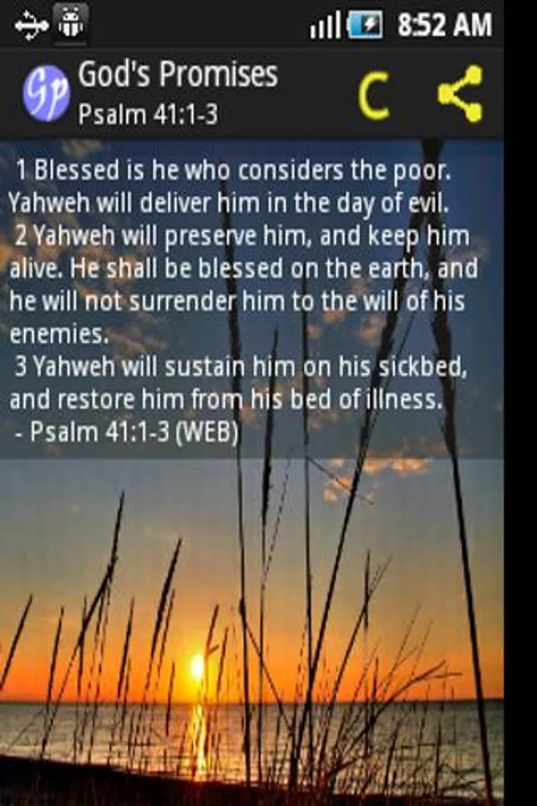 -Use the ‘share function’ to share your favorite bible verses of God's promises via Facebook, Twitter, SMS or other applications. (NOTE: to share with Facebook, use the copy button first, then click the share button, choose Facebook and paste through long-press)