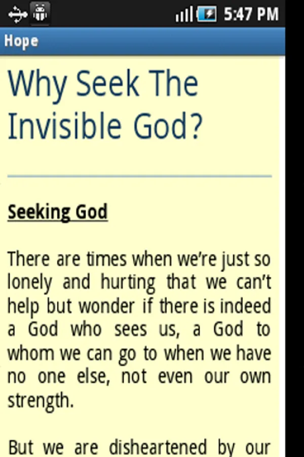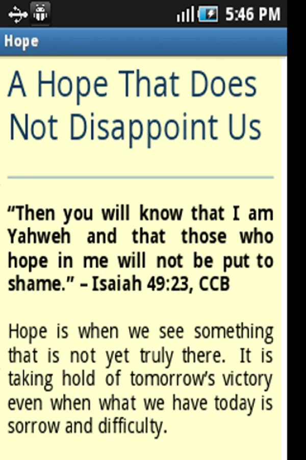 HOPE IN DIFFICULT TIMES is an inspiring app that will help you through your darkest times when all hope seems to be lost. You may be suffering right now, in pain, in financial difficulty, grieving for a lost loved one, brokenhearted, sick, jobless, homeless, stressed, alone, rejected or feeling depressed. But such times need not overcome our hope. HOPE is not something that depends upon our circumstances, talent, skills or resources. That is reasonable expectation. Our true hope depends upon a person who loves us most and a God in whom all things are possible – JESUS CHRIST!