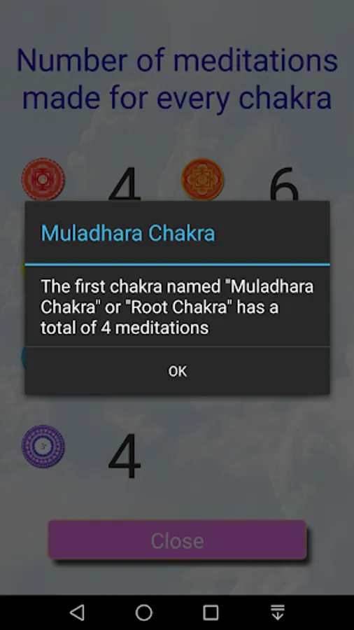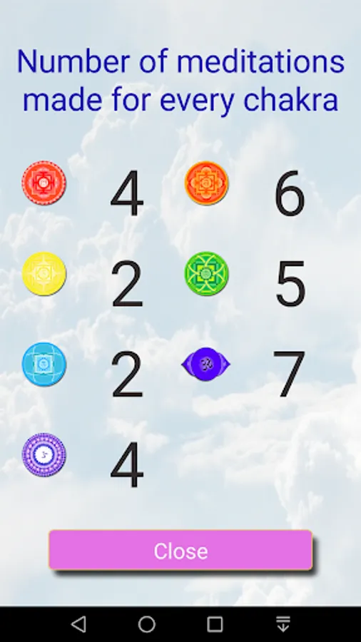 This is the pro version of the app, offers the ability to change the volume of music and reports usage statistics indicating the number of meditations performed for each chakra.