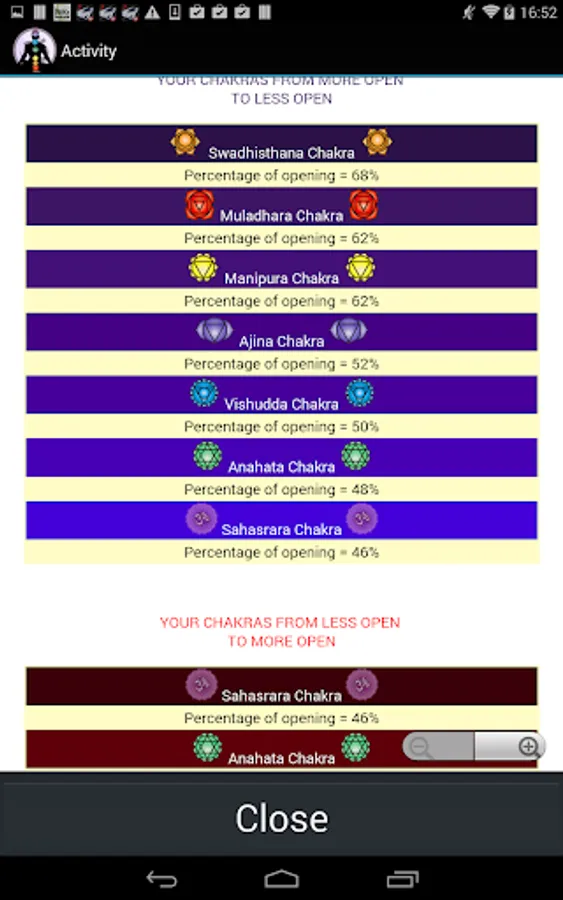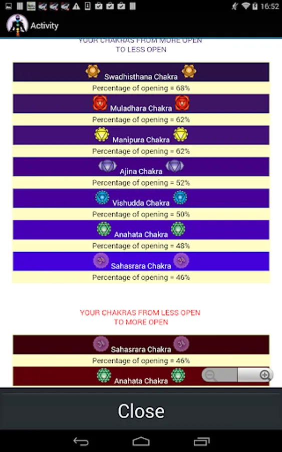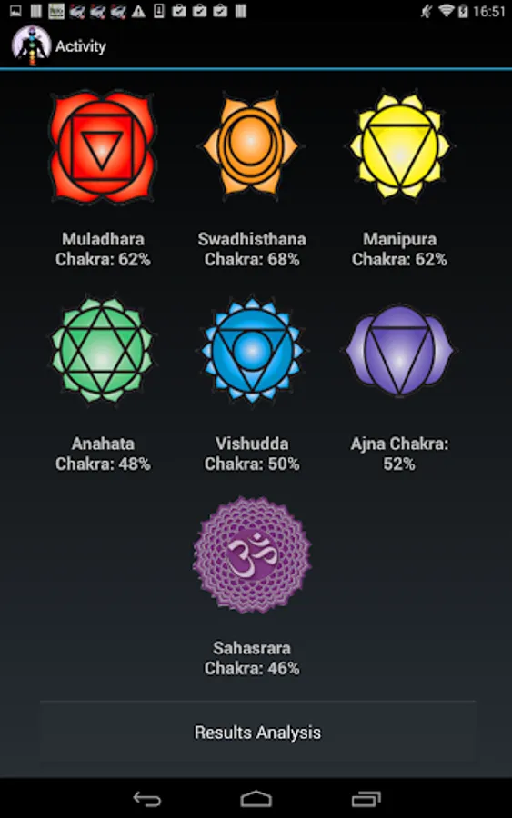 Answer all questions in the test trying to be totally sincere and honest and in the end you'll see a bar graph with the situation of your chakras.