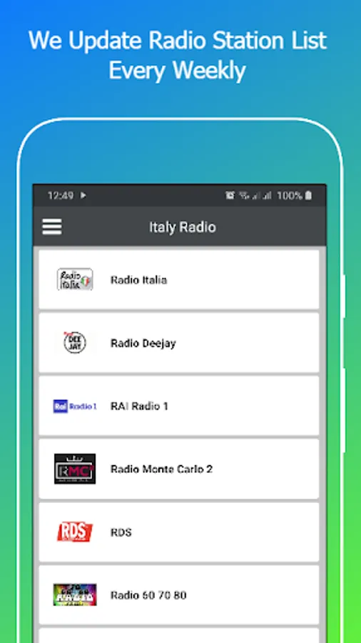 Italy online radio FM (Radio for Android Mobile) is an app to organization Internet Radio stations.Online radio FM allows you to listen and enjoy variety of genres bearing in mind classical, stone, pop, instrumental, hip-hop, talks, news, comedy, shows, gospel, songs, music, talks, news, comedy, shows, concerts and auxiliary variety of programs made contiguously by various Internet Radio Broadcasters across the Italy.