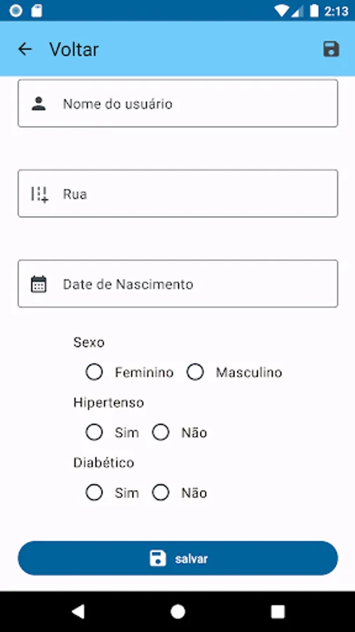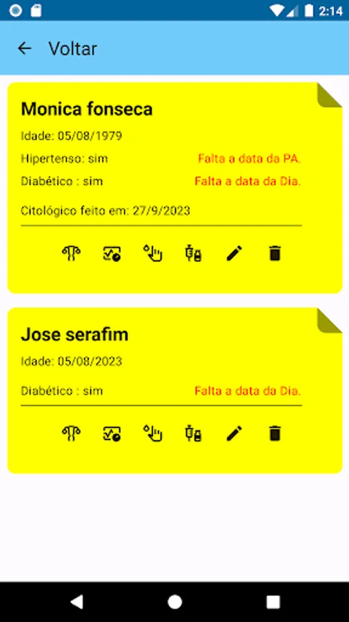 The acs2 application is intended for ACS, so that they can know the last date that the user carried out a blood pressure check, if the user has been walking for a long time to have their blood pressure checked, the same blood glucose levels and the cytopathological examination, the ACS may note the last date that a blood glucose test was carried out and the date of the last cytopathological examination. The application also has a reminder functionality for the ACS to take notes. It also makes it possible to create a table with the opening hours of the family health unit with its services offered, as these are constantly changing. Note: the data is stored locally, meaning it is not sent to any server. When the user deletes the application, the data will also be deleted together.