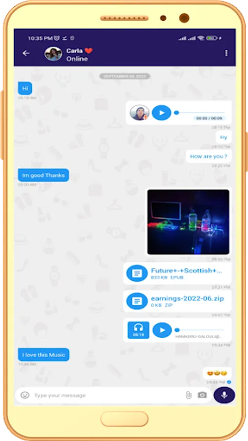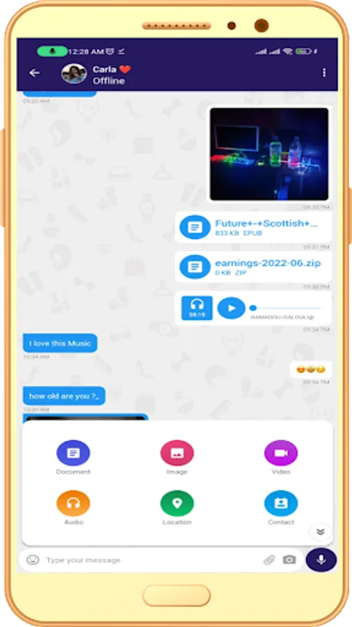 • Send File(Documents, Video, Audio, Location, Contact, Images, Voice Recording, Emoji...).