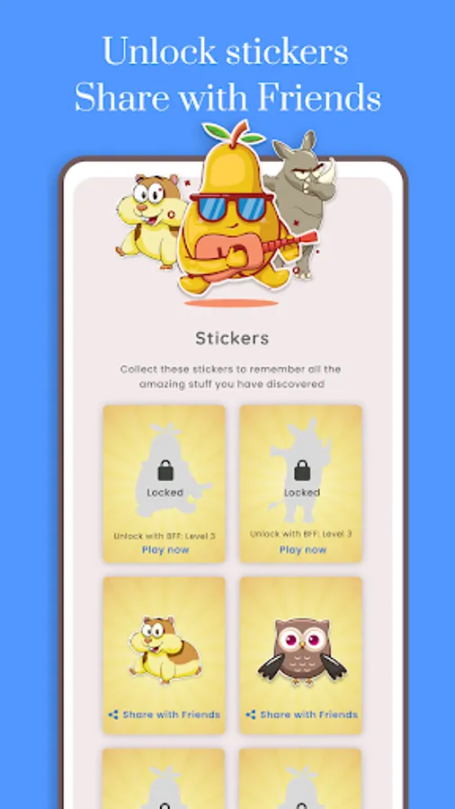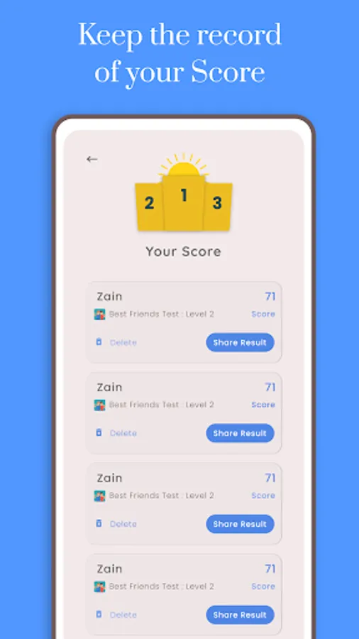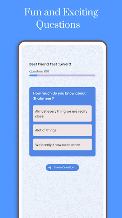 Share your true friendship result with your friends and in return to share your result, and for that they just have to answer interesting quiz questions from BFF games. While using best friend quiz app you can also share your friendship results.