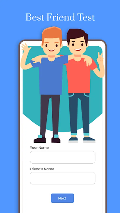 For BFF test enter your name and your friend name in friendship test app to start the friendship compatibility test. Answer friends quiz for best BFF test and check friendship score.